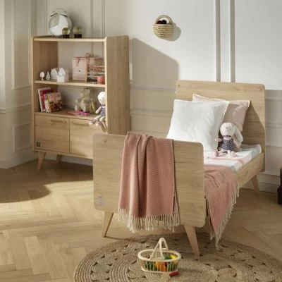 – 2 côtés, 2 portes, dessus volume 2 portes, dessus meuble, tablette mobile, dessous et derrière en panneaux de particules revêtus de papier décor chêne suave, chants décor bois.