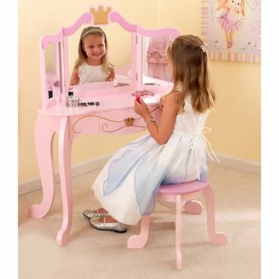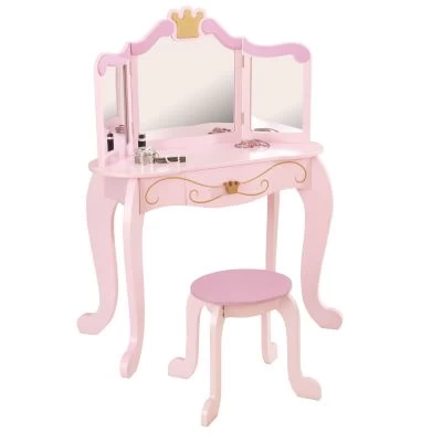 Coiffeuse avec miroir incassable, décor avec couronne d’or, tiroir de rangement coulissant pour les trésors spéciaux.
