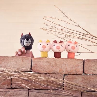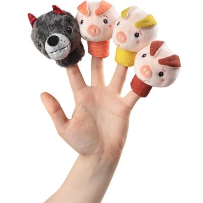– Lot de 4 marionnettes à doigt : 3 petits cochons et 1 loup.